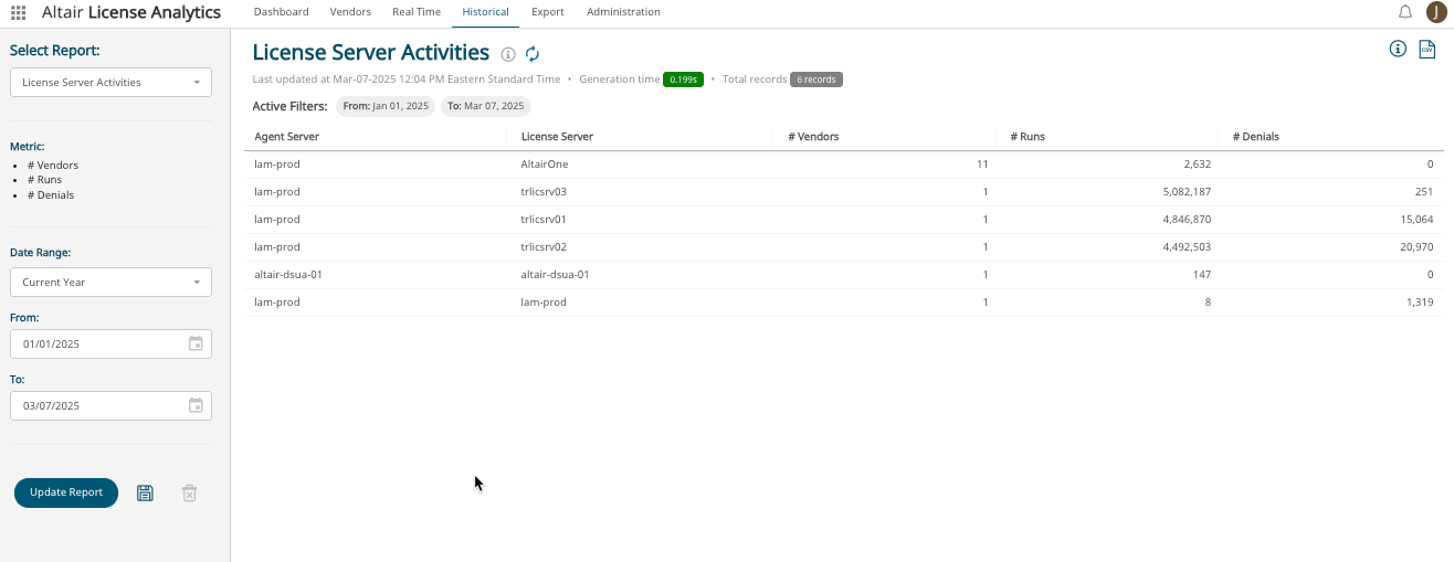 This report presents data based on the data collection agent server machines and the monitored license servers, showing the number of tracked software vendors, runs, and denials encountered.