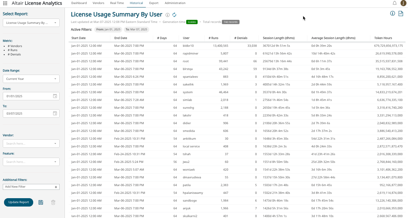 - To identify the users' software usage in terms of hours and number of checkouts. Also pay attention to the average session lengths to get an idea if user is appropriately checking out/checking in the software as needed.