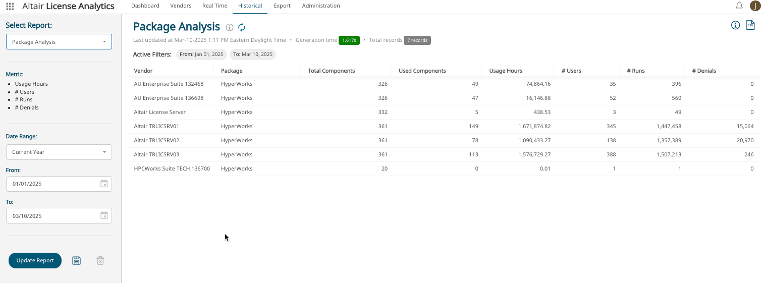 This report identifies software licensed through packages, bundles, or tasks and provides key performance indicators (KPIs), including the total number of components, usage hours, active users, runs, and denials.