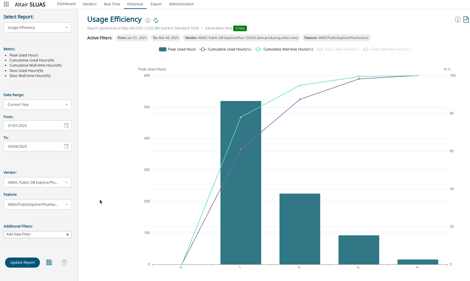 This report illustrates how efficiently software is utilized. By analyzing unique peaks and total hours used, we can identify the distribution of where peaks occur most frequently.