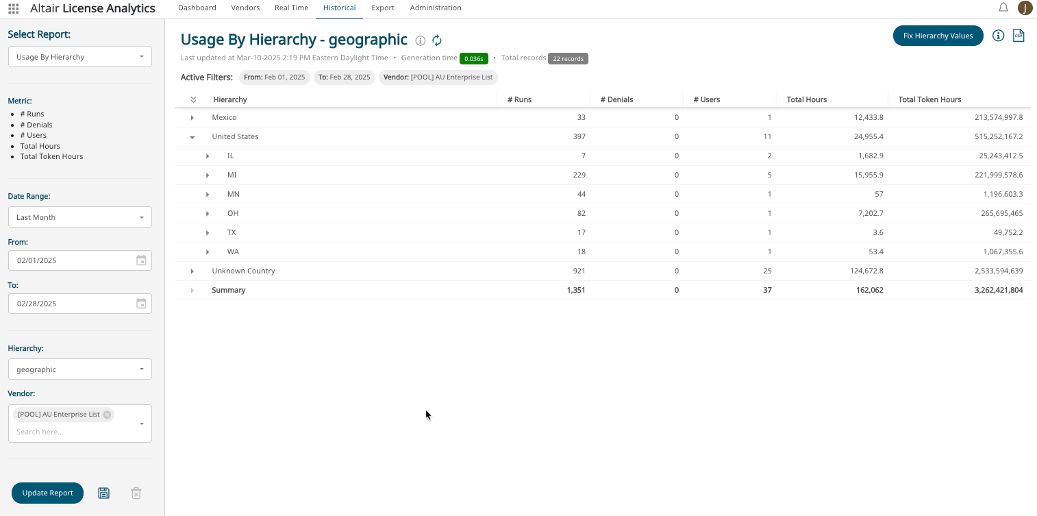 This report presents various metrics segmented by hierarchy for a specified time period. To generate this report, you must define at least one hierarchy using the Organizational Hierarchy module.