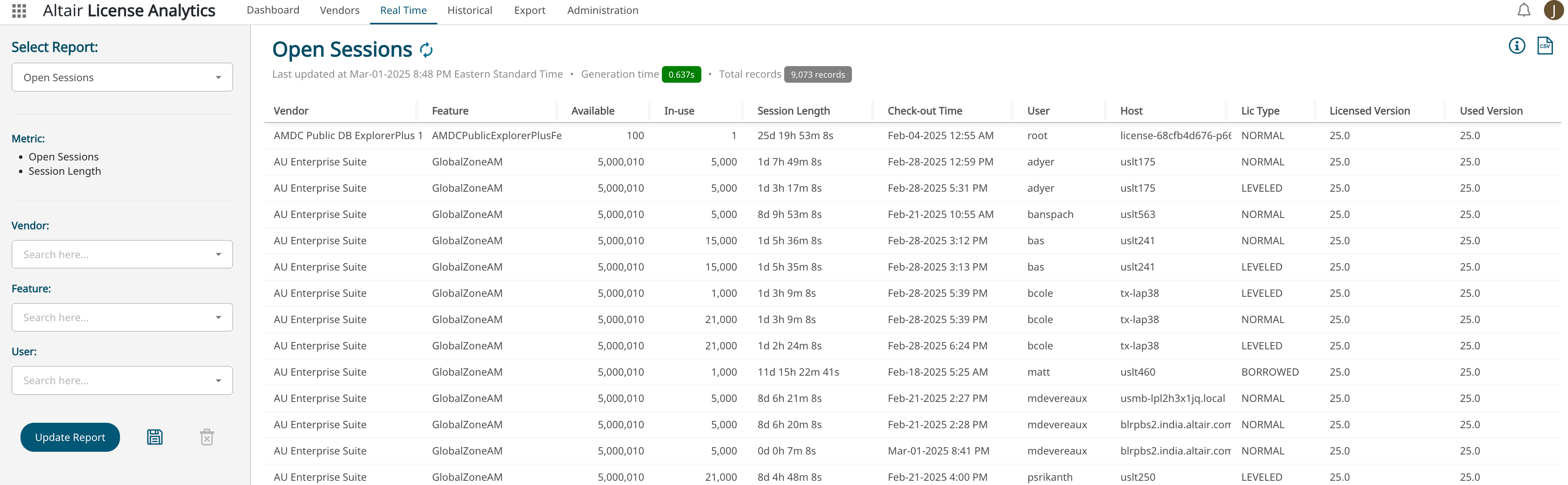 - Identify the current users who are using the software. Additionally, determine if any users’ session lengths align with the type of software being used. Alternatively, using the Software Status report, if a feature is nearing capacity, ensure no users have excessive session lengths.