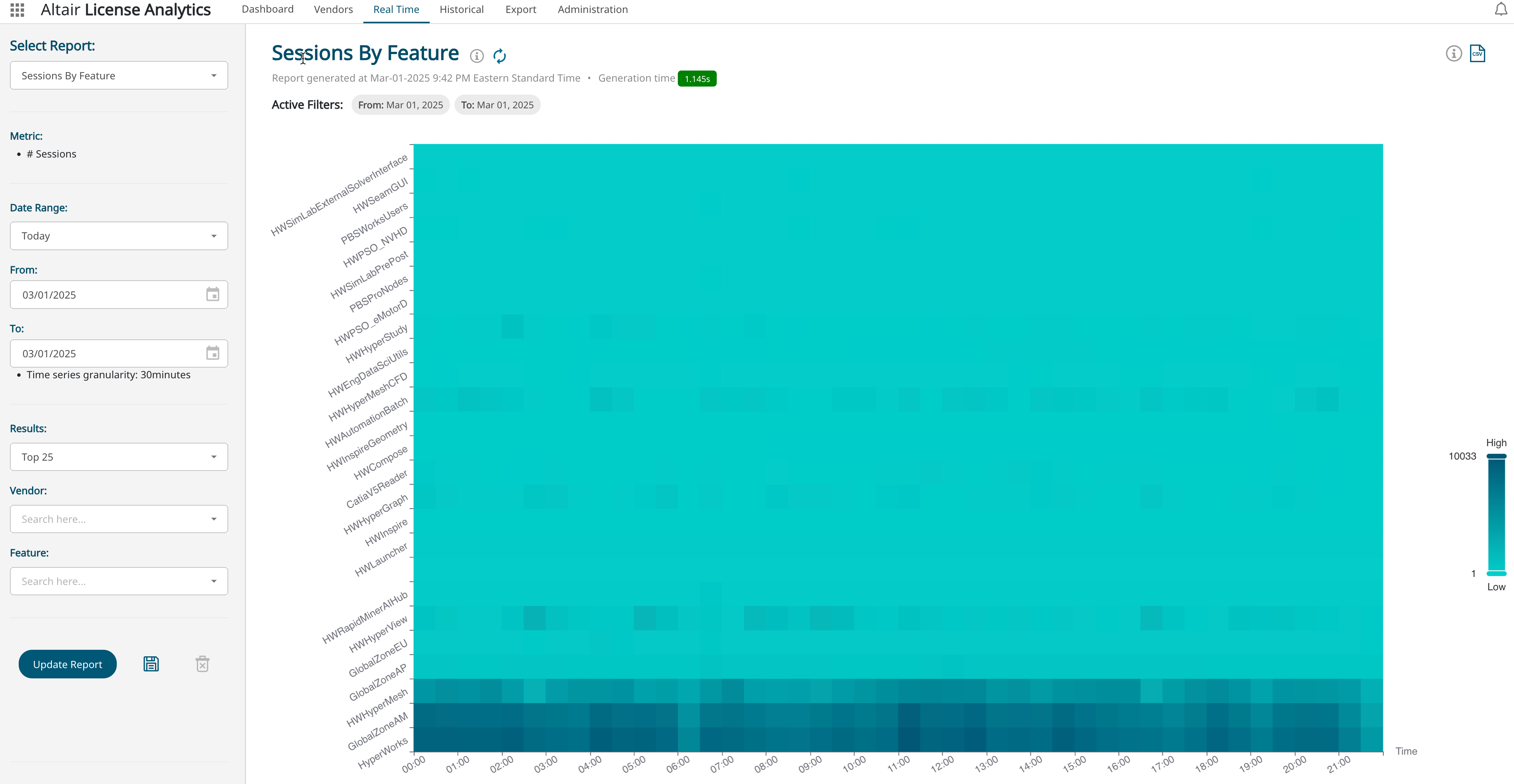This report presents a heatmap representation of software features showing the number of runs (NORMAL, BORROWED, LEVELED) over the last 24 hours or for the current day, starting at midnight.