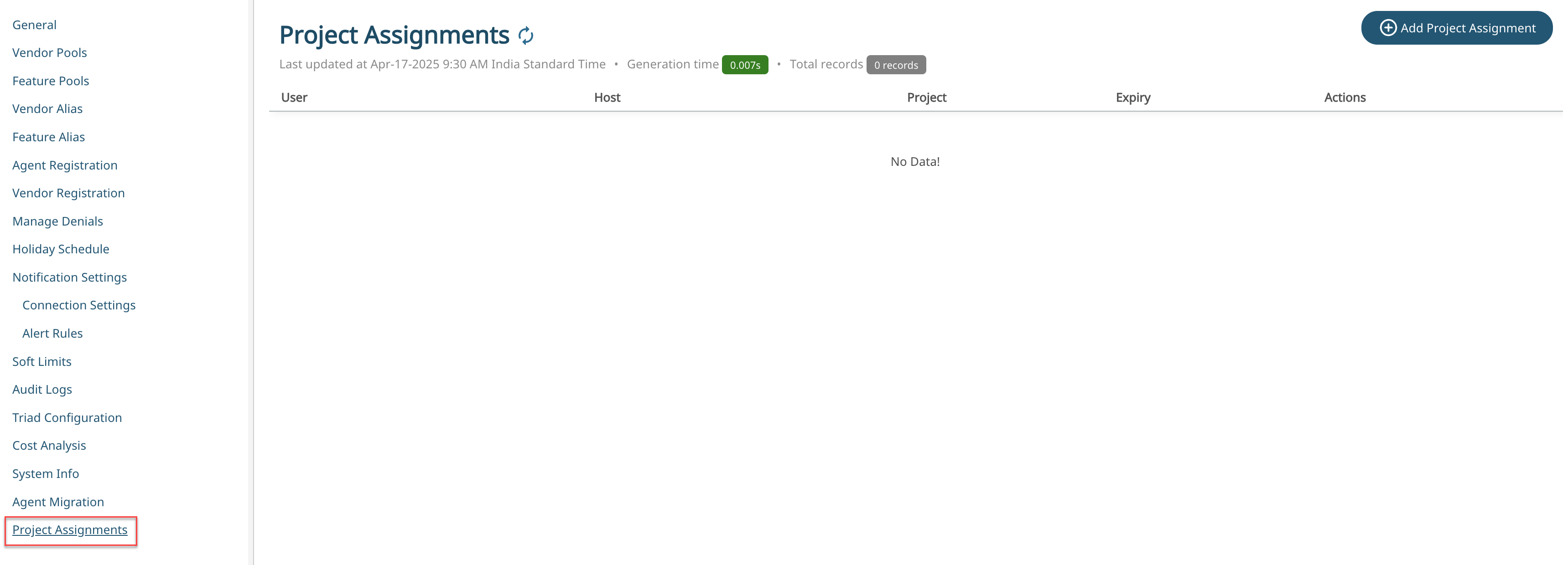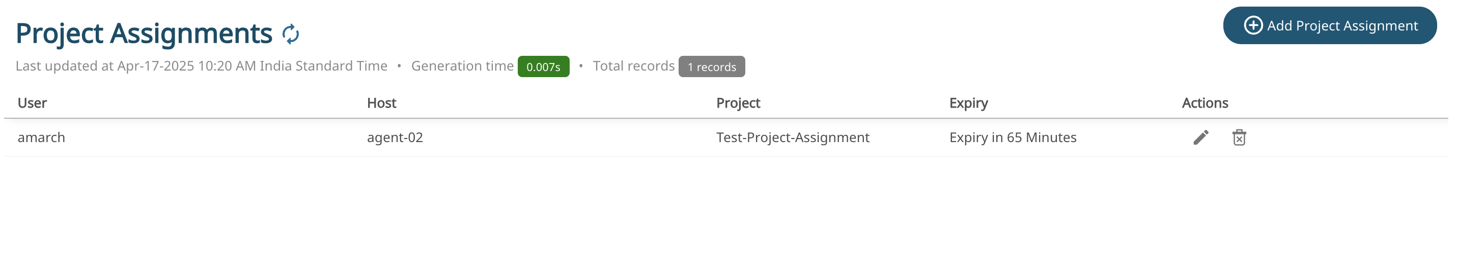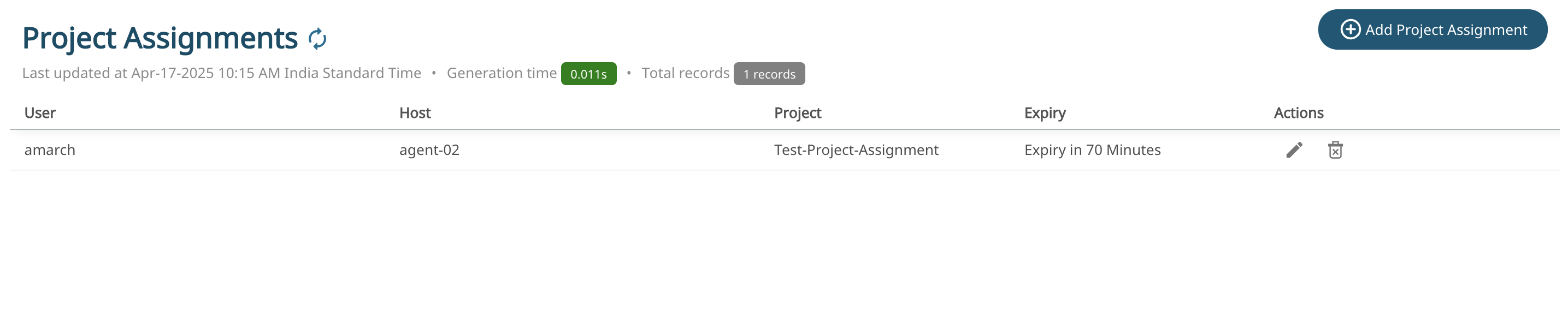 Note: You can edit or delete the project assignment.The project assignments will expire after the given time. Refresh to view the expiry or remaining time.Figure 9. Project Expiry Time