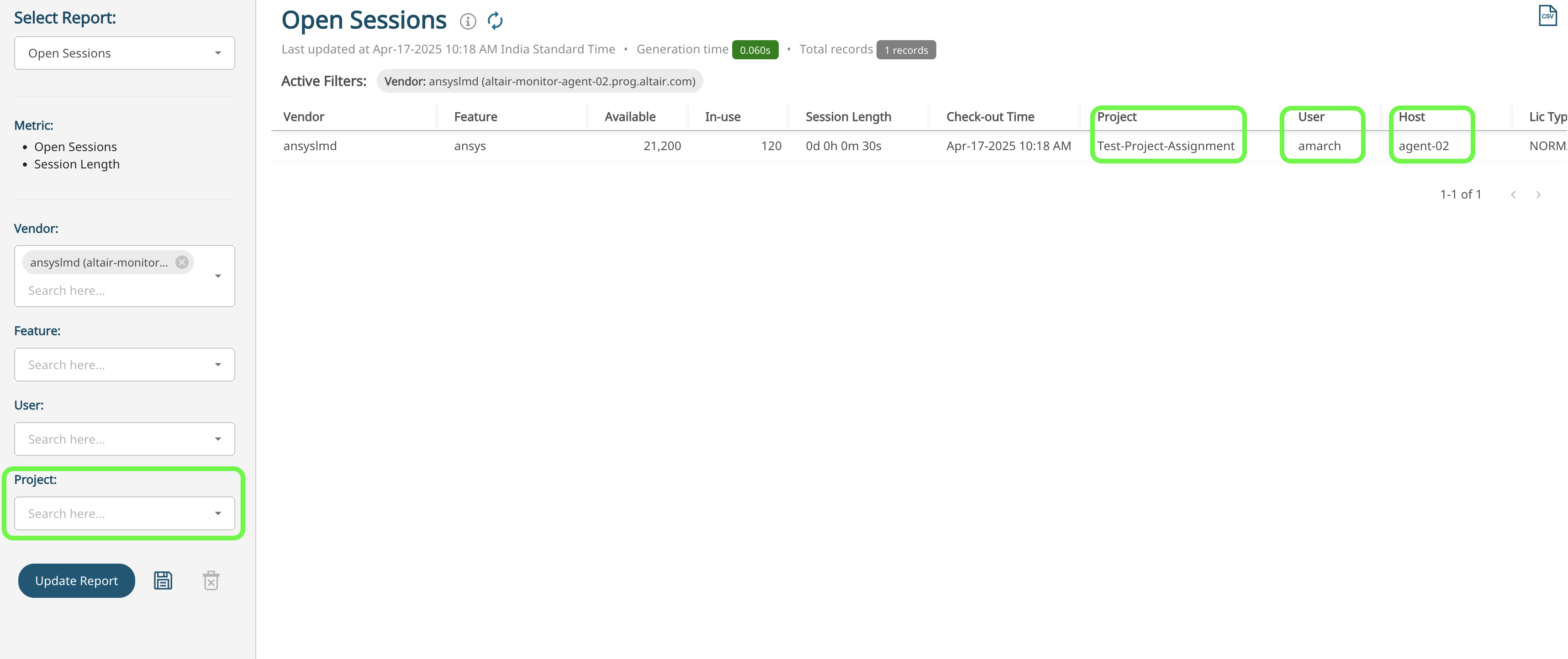 Any new open session records or checkouts/checkins adhering to the created user host combination should be assigned with the given Project Assignment. View the Project filter or Project column in the Open Sessions report.Figure 10. Project Filter and Project Column