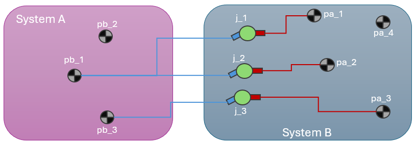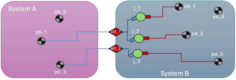 System B now has 2 attachments, att_1 and att_2. Parts from system A are referred into these attachments and the joints use the attachments instead of the parts. If system A needs replacement, updating attachments for system B would be sufficient to restore any unresolved references within system B.