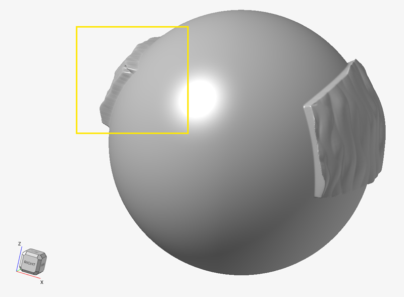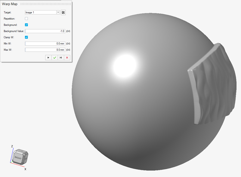 をクリックする(またはEnter キーを押す)ことをお勧めします。これにより、シーンの境界ボックスは、ワープマップから生じるフィールド駆動型オフセットに対応するようにリサイズされます。この操作を行わない場合、下のイメージに示すようにテクスチャのクリッピングが発生する可能性があります。この例では、8mmと入力してから、OK