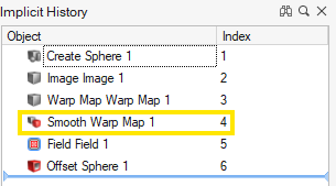 - 最終的な推奨事項として、一部の領域にのみテクスチャを追加する唐突な処理は、視覚的なアーティファクトを引き起こす可能性があります。これらの多くは、インプリシットモデリングリボンのスムースツールを使用し、ワープマップオブジェクトに適用することで改善できます。このスムージング処理を適用する適切なタイミングは、ワープマップオブジェクト作成直後です。