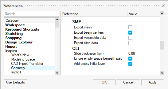 エクスポートした3MFファイルにスライスデータを追加するには、スライスデータをエクスポートチェックボックスを選択します。3MFファイルとCLIファイルの両方のスライス厚を制御するには、CLI設定のスライスの厚みをミリメートル単位で必要な値に設定します。