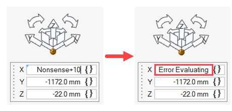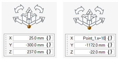 モーション解析のエンティティ(ポイント、ボディ、ブッシュ、スプリングダンパ、荷重など)の入力フィールドには、式を含めることができます。これらのフィールドは、プロパティエディター、ガイドパネル、またはマイクロダイアログで利用可能であり、多くの場合、中括弧アイコン