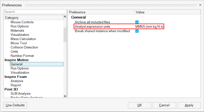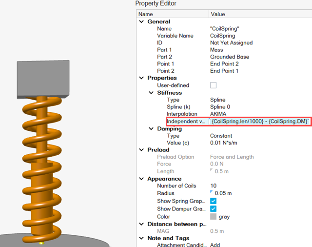 この場合、CoilSpring.lenはスプリングダンパの取り付け長を示す解析パラメトリック式です。その評価値は式の単位系です。この式は、ソルバー単位(MKS)に変換するためにスケーリングする必要があります。