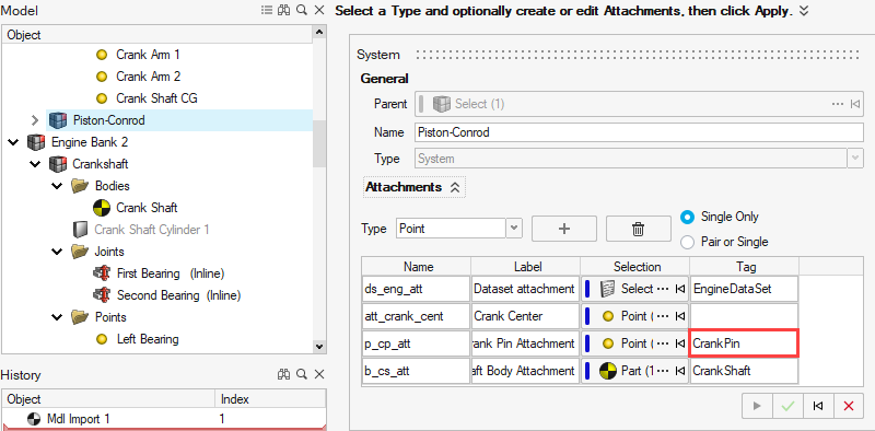 チェックされていない場合、単一のエンティティのみがアタッチメントに解決できます。Inspireで作成するほとんどのアナリストエンティティと同様に、アタッチメントエンティティはシングルエンティティまたはペアエンティティにすることができます。ペアのエンティティは、対称の特性を持つモデルを作成する場合に役立ちます。詳細については、Inspire Motionのペアと対称モデリングを参照してください。