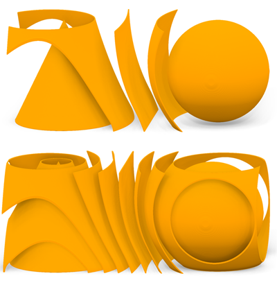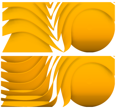 2개의 암묵적 바디 사이에 있는 하나 이상의 표면 또는 볼륨을 생성합니다. 이 기능은 두 파트/표면 사이에 필드 기반 효과를 생성하거나 두 파트 또는 표면 사이에 균일한 간격으로 표면을 생성할 때 유용합니다.