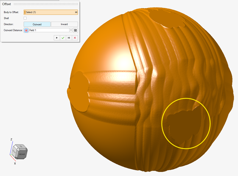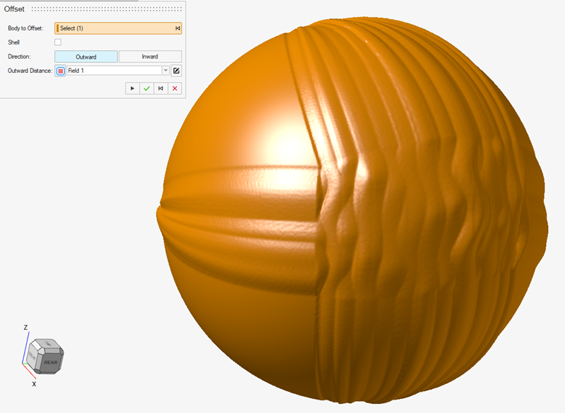주: 이미지가 뒤틀기 맵(구형)을 받는 암묵적 바디와 겹치는 경우, 컨스트럭션 이력을 이미지가 생성된 직후로 롤백하고 암묵적 모델링 바디 이동 도구를 사용하여 위치를 조정할 수 있습니다. 이 작업을 수행한 후 꼭지점 리샘플을 선택하여 꼭지점을 새 이미지 위치로 이동해야 합니다. - 2개의 컨트롤 케이지가 설정되었으므로 이제 뒤틀기 맵을 기반으로 하는 필드를 생성하고 이 필드를 오프셋 작업에 연결하여 뒤틀기 맵 효과를 처음으로 정확하게 확인할 수 있습니다. 이 지점에서 뒤틀기 맵을 수락한 후 언제든지 다시 돌아가 다양한 매개변수를 만족스러운 모양이 될 때까지 조정할 수 있습니다.