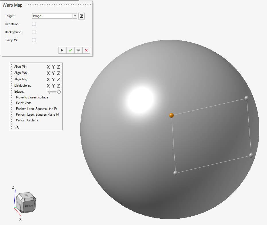 이제 암묵적 구형 바디의 표면에 3D 그리드를 위한 컨트롤 케이지 꼭지점을 배치할 수 있습니다. 이러한 꼭지점의 배치를 완벽히 제어할 수 있습니다. 하나 이상의 꼭지점을 선택한 후 클릭하고 끌어서 이동할 수 있습니다. 컨트롤 꼭지점을 보이는 바디 위로 끈 후 마우스 버튼을 놓으면, 해당 꼭지점이 (화면을 들여다 볼 때) 꼭지점 아래에서 가장 가깝게 보이는 표면에 스냅됩니다. 꼭지점을 보이는 바디 위로 끌어서 빈 공간에 놓지 않을 경우, 꼭지점은 시야면과 항상 평행한 평면에 유지됩니다. 곡선의 끝과 같이 인식 가능한 피처 위로 마우스를 이동하면 스냅 옵션을 끄지 않는 한 해당 피처에 스냅하려고 자동으로 시도합니다. 마지막으로 위치 팝업 창의 작은 좌표계 아이콘을 통해 좌표를 입력하여 컨트롤 꼭지점을 정확하게 배치하거나 오프셋할 수도 있습니다.먼저 다음 이미지와 같이 3D 그리드의 모서리를 나타내는 4개의 컨트롤 케이지 꼭지점을 배치하는 것이 좋습니다. 드레이프된 모델을 왜곡할 수 있습니다. 그러면 암묵적 바디의 표면에 드레이프될 때 이미지가 기울어집니다. 왜곡을 최소화하려면 모서리를 사각형 구성으로 정렬하십시오. 위치 팝업 창의 옵션은 매우 유용할 수 있습니다.