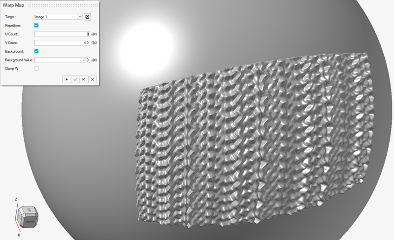 - 뒤틀기 맵을 편집하는 경우 배경 확인란을 선택합니다. 배경 값 옵션은 컨트롤 케이지의 외부(따라서 선택한 2D 이미지 영역 외부)에 있는 모든 지점의 픽셀 값을 설정합니다. 이 예제에서는 오프셋을 사용하지 않고 원래 표면을 컨트롤 케이지 외부의 동일한 위치에 유지합니다. 이미지 픽셀 값을 [-1, 1] 범위 이내로 정규화했으므로 적절한 배경 값은 이 범위에서 가장 낮은 값인 -1입니다. 이 값은 앞서 생성한 필드를 기반으로 0 오프셋에 매핑되는 값이기도 합니다. 이렇게 변경하면 다음 이미지와 같이 텍스처가 컨트롤 케이지에 한정됩니다.