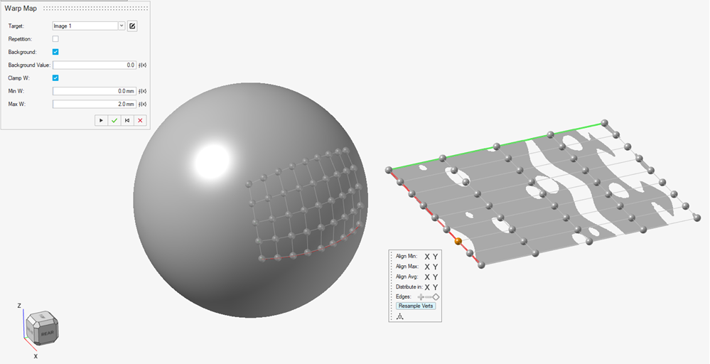 - 이제 뒤틀기 맵 기반 표면 오프셋을 받을 암묵적 바디를 선택하겠습니다. 이 예제에서는 구를 클릭하겠습니다. 이 구가 작업할 바디입니다. 이 모델을 클릭하면 두 가지 일이 일어납니다. 먼저 장면에 새 객체가 나타나며, 이 객체는 구형에 드레이프할 수 있는 변형 가능한 뒤틀기 맵 객체입니다. 여기에는 자체 빨간색(U) 및 녹색(V) 좌표축을 가진 등가 컨트롤 케이지가 있습니다. 또한 이 그리드와 이미지 객체에 연결된 그리드 사이의 컨트롤 꼭지점 간에는 일대일 대응이 있습니다. 이 지점에서 장면은 다음과 같으며, 구 아래에 새 뒤틀기 맵 바디가 있고 구 오른쪽에 이미지 객체가 있습니다.