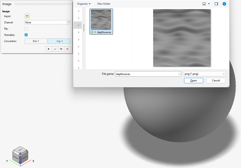 을 클릭하여 뒤틀기 맵 작업에 사용할 필드 정보가 포함되어 있는 이전에 생성한 2D 이미지를 선택합니다. 이 예제에서는 회색조 색상 데이터를 사용하여 구의 로컬 표면 오프셋 양을 제어하는 파장이 있는 패턴을 사용하고 있습니다.주: 현재 릴리스에서 이미지를 가져오려면 .png 파일 형식이 필요합니다.