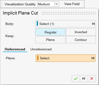 수동으로 정의되거나 연결된 기준 면을 사용하여 암묵적 바디를 절단합니다. 평면의 양쪽에서 바디를 유지하거나 슬라이스 평면 자체와 교차된 바디의 필드 또는 윤곽만 유지하도록 선택합니다.