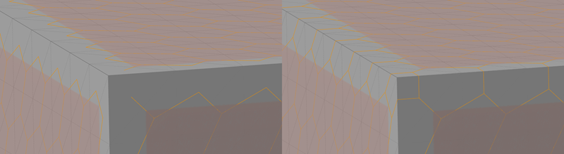 다음 이미지는 직접 커넥션 옵션을 사용하는 닫힌 래티스의 클로즈업을 보여줍니다. 표면 점 사이에 새로 생성된 모든 엣지는 직선입니다.