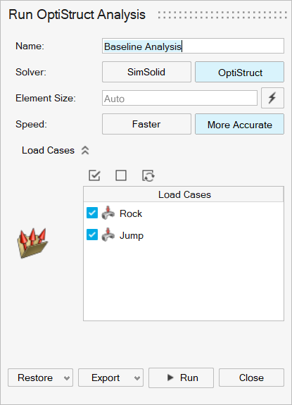 해석 실행 창에서 옵션을 사용해서 해석을 정의합니다. 옵션은 SimSolid 또는 OptiStruct 솔버의 선택 여부에 따라 달라집니다.