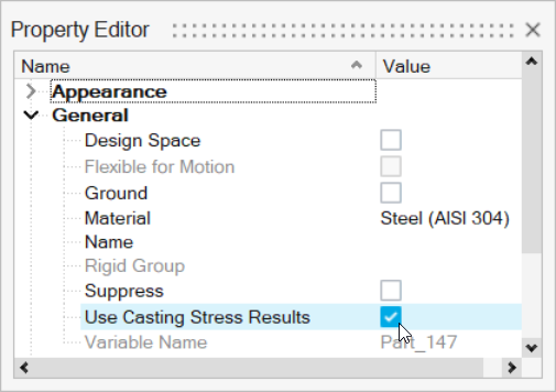 해석을 시작하기 전에 F3 키를 눌러 속성 편집기를 표시하고 주조 응력을 계산하려는 주조 엔티티를 선택한 후 주조 응력 결과 사용 확인란을 선택합니다.