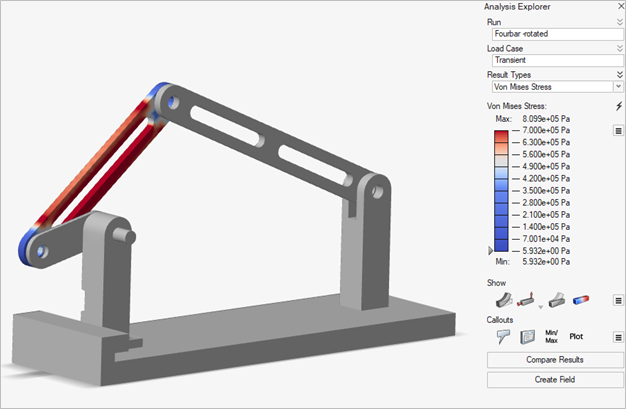 애니메이션 슬라이더를 끌어 놓아서 애니메이션을 재생하고 메커니즘 이동 중에 응력 변경을 확인합니다.