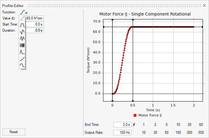 函数是 Motion Analyst 中力与运动实体的小对话框内的一个选项,让您可在轮廓编辑器内部调用预定义函数。