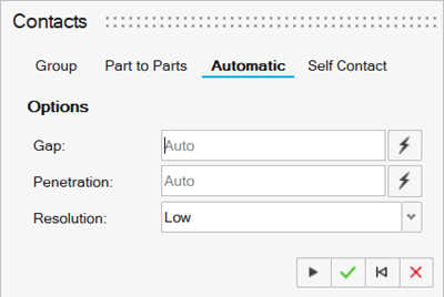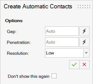 注: 在导入的 CAD 文件上打开接触工具时,将显示“创建自动接触”操作面板。要关闭此行为,请勾选不再显示复选框。
