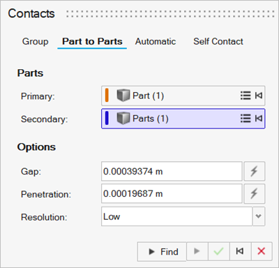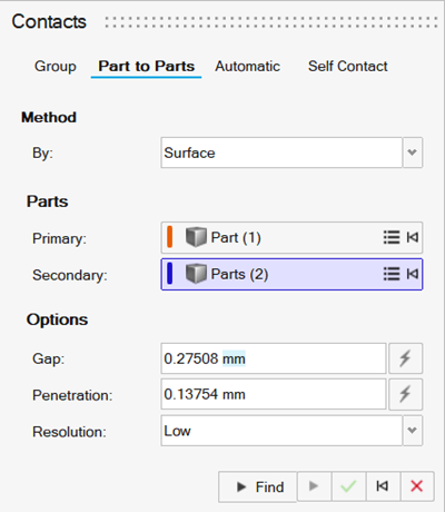 该工具会检测模型中可能存在的接触。如果未找到接触,则可增加搜索距离,以查找零件之间的接触。