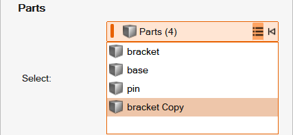 可展开或折叠所选零件列表。可以右击选中的零件,然后选择删除,将其从选择中删除。