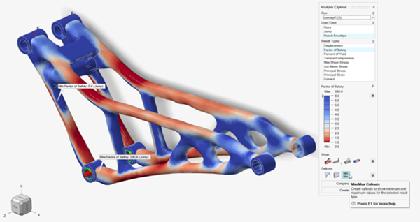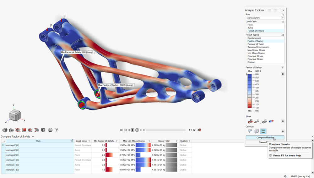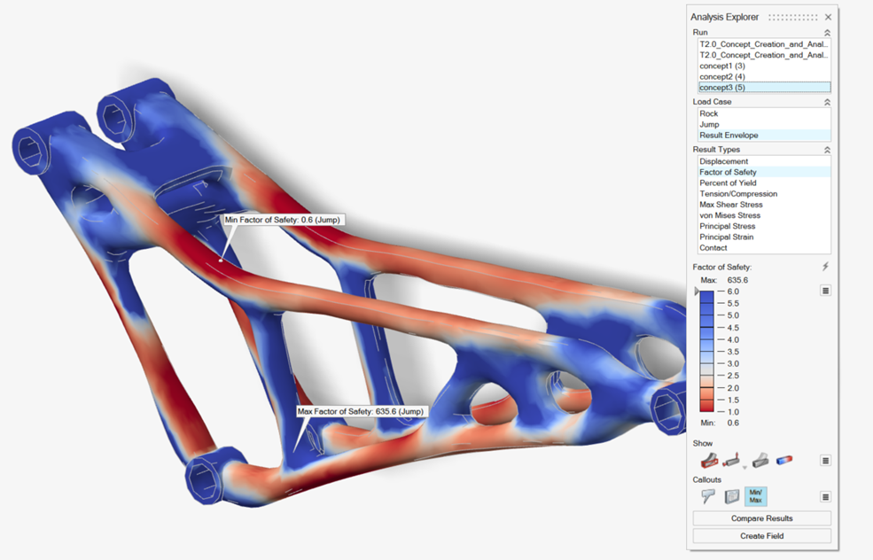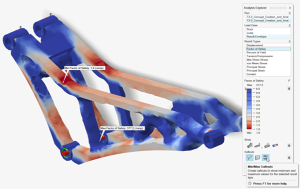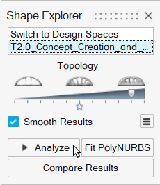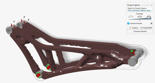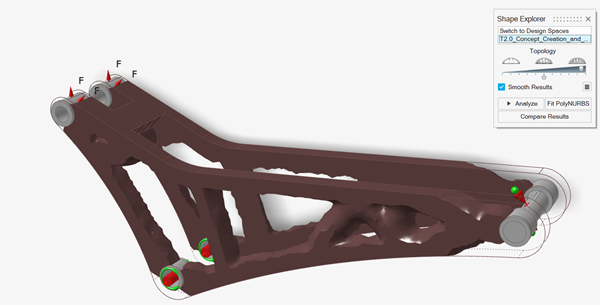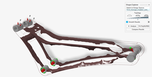 使用形状浏览器中的分析按钮,根据显示的拓扑结果和原始载荷工况自动生成并求解有限元模型。这种重新分析可快速显示零件性能,表明拓扑概念是否可行。