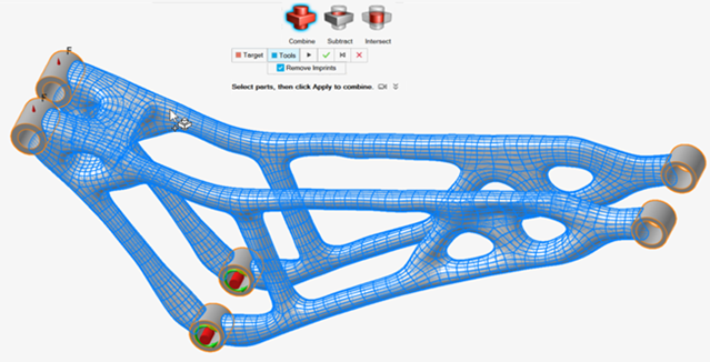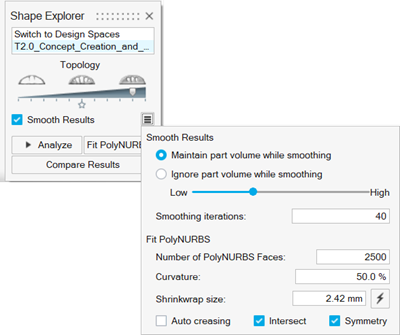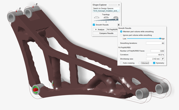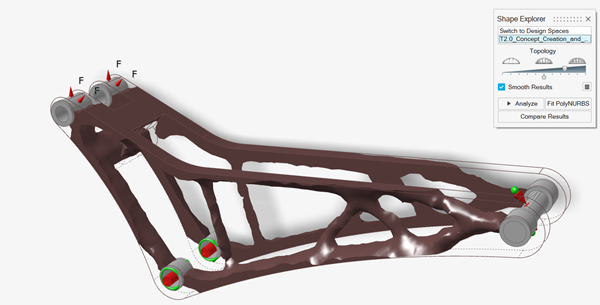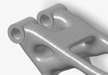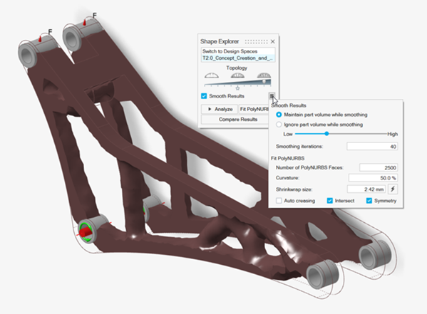 注: 注意 PolyNURBS 几何体与原始设计空间相交处的平面几何特征。另外,请注意有些成员略显不规则。部分原因是由于几何细节的 PolyNURBS 面数较多,曲率相对较高。这使得拟合结果紧跟拓扑结果的细节。通过减少这些参数,通常可以获得更平滑的几何体,实质上是对较小的细节进行平滑处理。 -