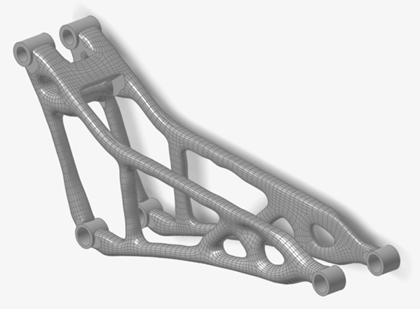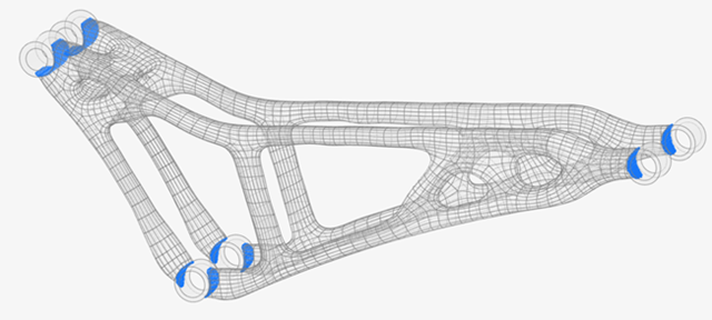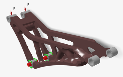 本教程从应用于山地自行车悬挂组件的结构拓扑优化结果开始。优化的目的是使用 15% 的可设计材料,在两种载荷工况下最大限度地提高零件的刚度。