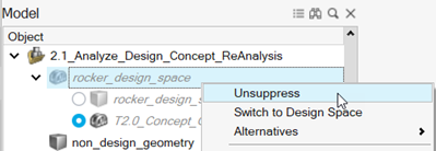 在模型浏览器中,右键点击 rocker_design_space 并选择解除抑制。