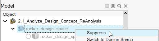 在模型浏览器中,右键点击 rocker_design_space 并选择抑制。