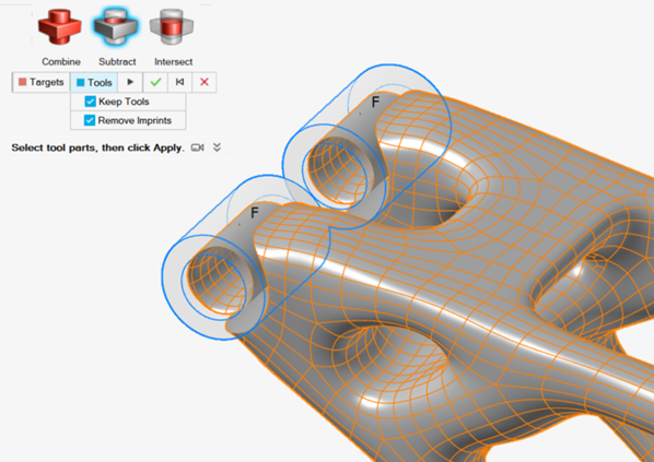 并选择设计零件和非设计零件,将它们包覆在一个等值面中。 - 在 PolyMesh 功能区上,选择平滑工具