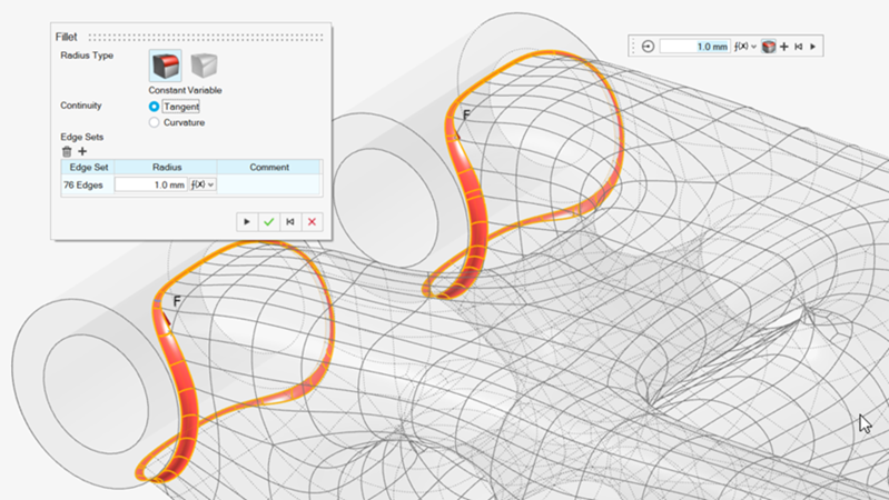 请注意,拟合结果的面数较少,没有布尔交集产生的尖锐几何特征,并且会与非设计几何体重叠。