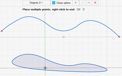 在操作栏中,选择关闭样条,以便在创建样条时将其关闭。在下面的示例中,上样条是在未选择关闭样条的情况下创建的,下样条是在选择关闭样条的情况下创建的。