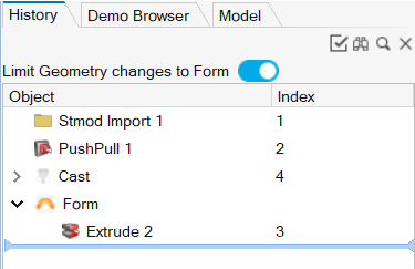 When you create, modify, move, or delete geometry in your model, or group parts together in the Model Browser, Inspire Extrude records the action in your model’s construction history.