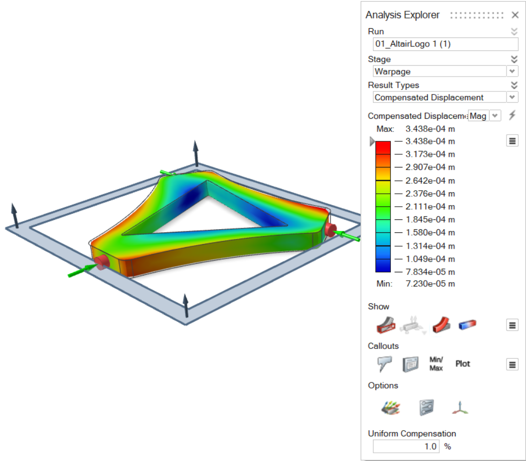 Use the Uniform Compensation field to quickly visualize how isotropically enlarging the mold cavity will affect the finished part. If large warpage displacements beyond the compensated contraction appear, either process parameter changes or more complex mold cavity modifications--or possibly both--are needed. ![]() |