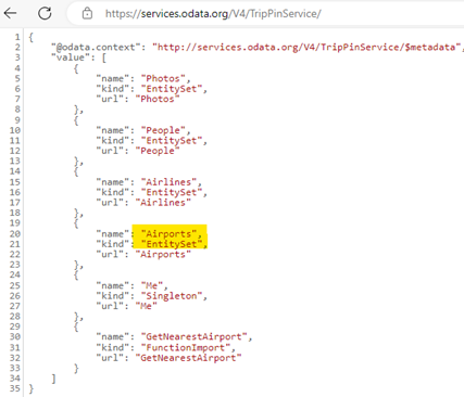Dans le navigateur, allez à https://services.odata.org/V4/TripPinService/$metadata pour afficher le modèle de données d’entité du service OData. Recherchez « GetNearestAirport » sur la page et trouvez la valeur de jeu d’entités.