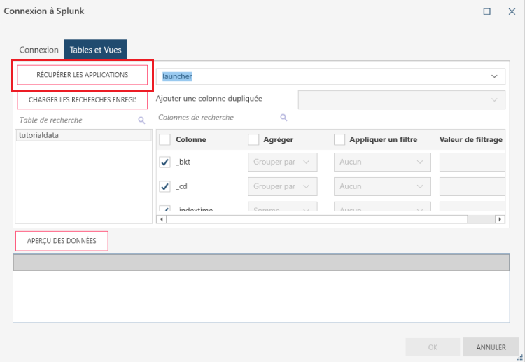 Sélectionnez OK pour établir la connexion et extraire les données ou Annuler pour fermer la boîte de dialogue. L’aspect des boutons OK et Aperçu indique l’état de votre connexion :