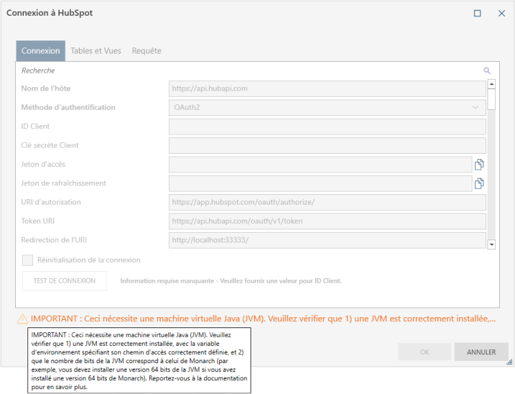 Si la JVM requise n'a pas été configurée correctement et que le connecteur est sélectionné dans la liste des connecteurs, la boîte de dialogue correspondante s'affiche en grisé. Un message d'avertissement apparaît également ; pour consulter les détails de l'avertissement, placez le pointeur de la souris sur le message.