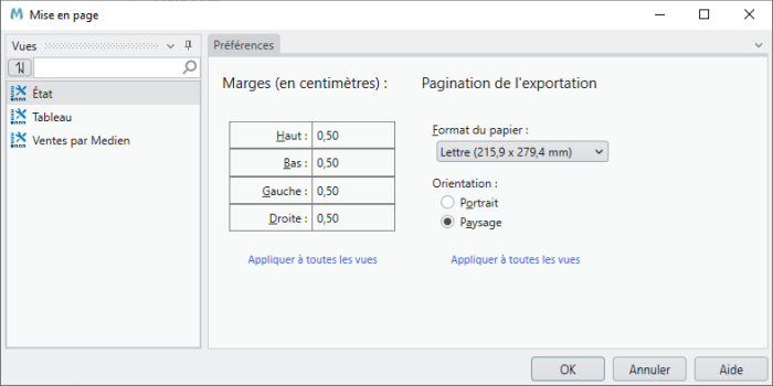 Cliquez sur cette option pour appliquer la définition de la marge à toutes les vues (si vous effectuez une définition pour une table) ou à tous les récapitulatifs (si vous effectuez une définition pour un récapitulatif). |
