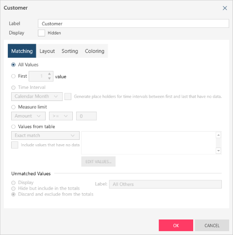 When selecting First N Values, Values from table, or Measure limit, you also have the option of grouping all other values under a single label that appears in the summary. This feature can be useful when breaking out specific key field values that you want to compare against the entire data set.