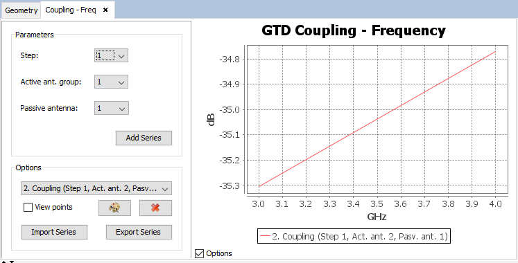 When this option is chosen from the Show Results > Coupling > Antenna Coupling By Frequency menu, the panel presented in the figure below will appear.