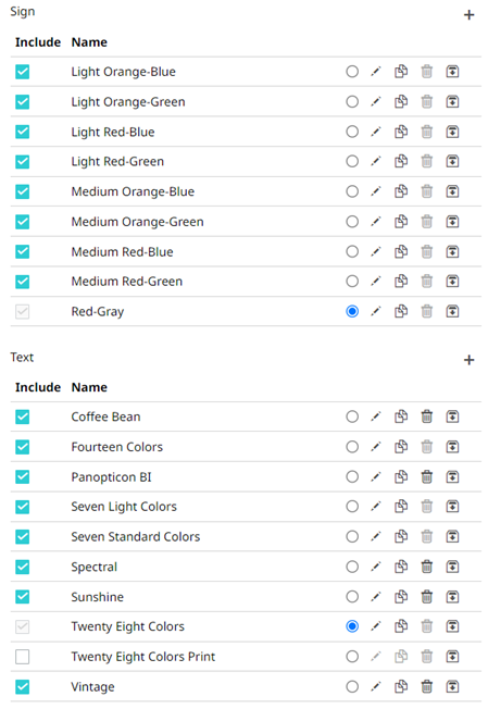 Single, sign, text, sequential, and diverging color palettes that is used in text or numeric color variables in visualizations can be created, imported, exported, modified, duplicated, or deleted in the Color Palettes tab of a Theme page.