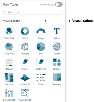 The Part Types pane has five sections to define the settings of the dashboard visualization or part.