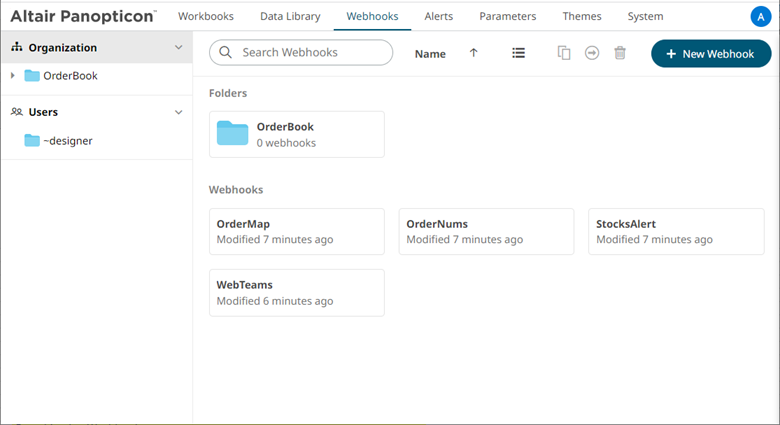 On either display view style, clicking on a webhooks title or thumbnail displays the Webhooks page.